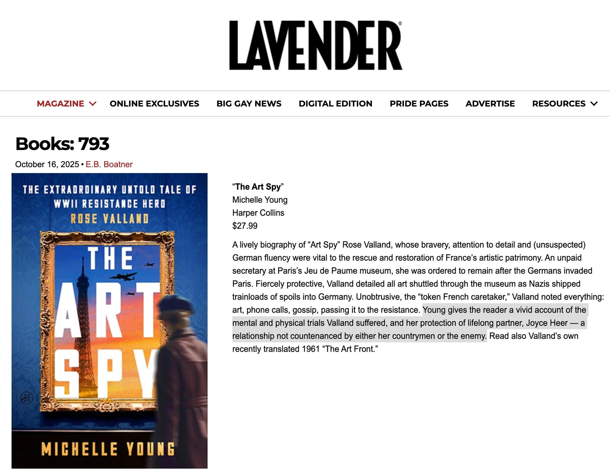 “A lively biography…Young gives the reader a vivid account of the mental and physical trials Valland suffered, and her protection of lifelong partner, Joyce Heer — a relationship not countenanced by either her countrymen or the enemy.”